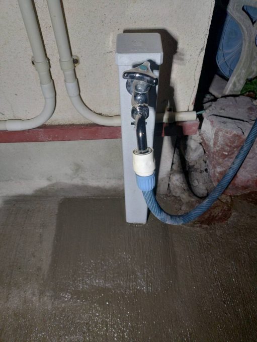 コンクリートを削って給水管を引っ張り直し、水栓柱を取付けた後コンクリートで埋め戻して作業完了となりました。