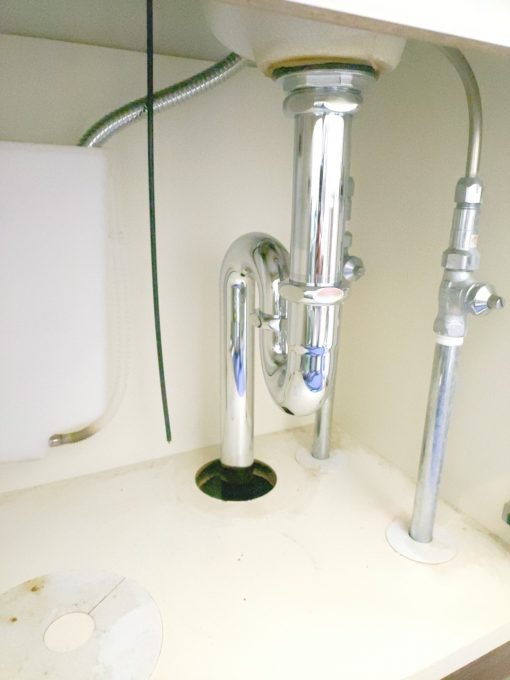 まずは折れてしまっている古い排水栓を交換する事為に下が濡れないように養生をして外していきます。この時かなりナットが硬くなっており潤滑油を使いながら慎重に作業していきます。取り外しが終わったら汚れている口の周りを綺麗にして新しい排水栓を取り付けていきます。